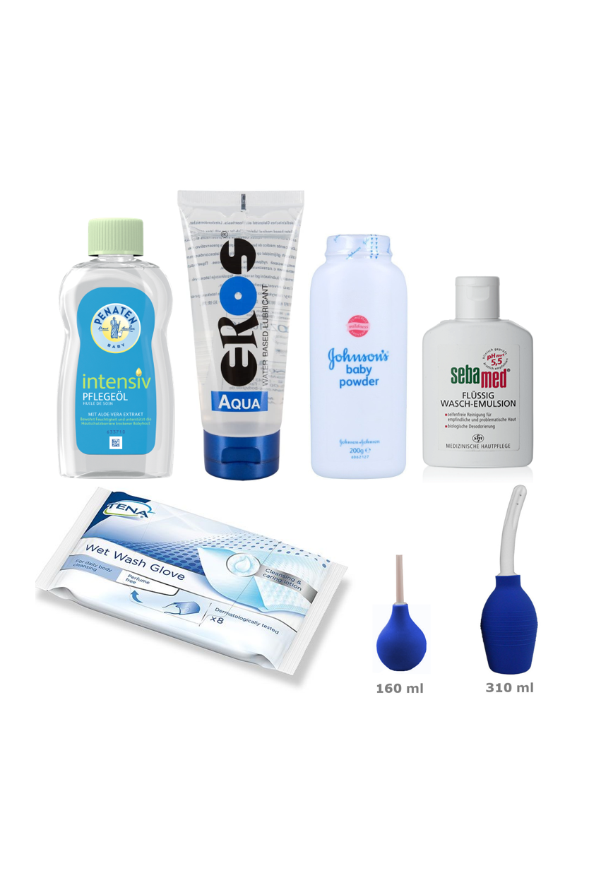 **Product Description: Cleaning Set Includes:** - **1x Large Spray Pump: 310 ml** (e.g., for rinsing the opening with lukewarm water) - **1x Small Spray Pump: 160 ml** (e.g., for rinsing the opening with a disinfectant) - **1x Baby Oil: 100 ml** - **1x Talcum Powder: 100 g** - **1x Seba Med Soap** - **1x Cleaning Wipes Set** - **1x Eros Aqua Lubricant: 200 ml**